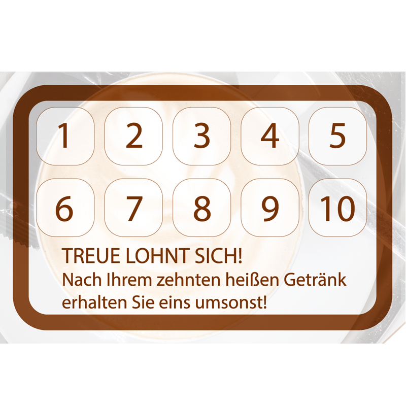Kaffee Treuegutschein. Nach Ihrem zehnten heißen Getränk erhalten Sie eins umsonst!